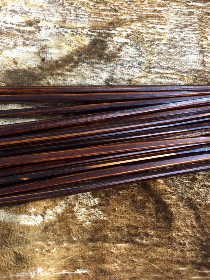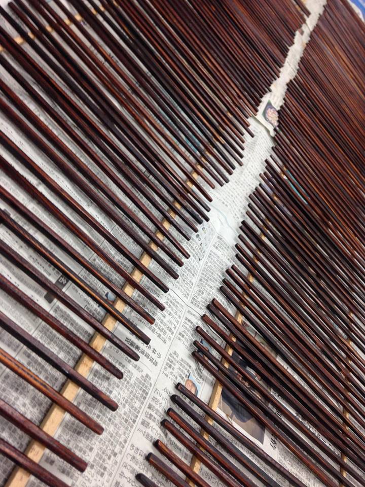 割り箸のササクレを落とし、先端を磨き1回目の漆を約200本塗りました。
