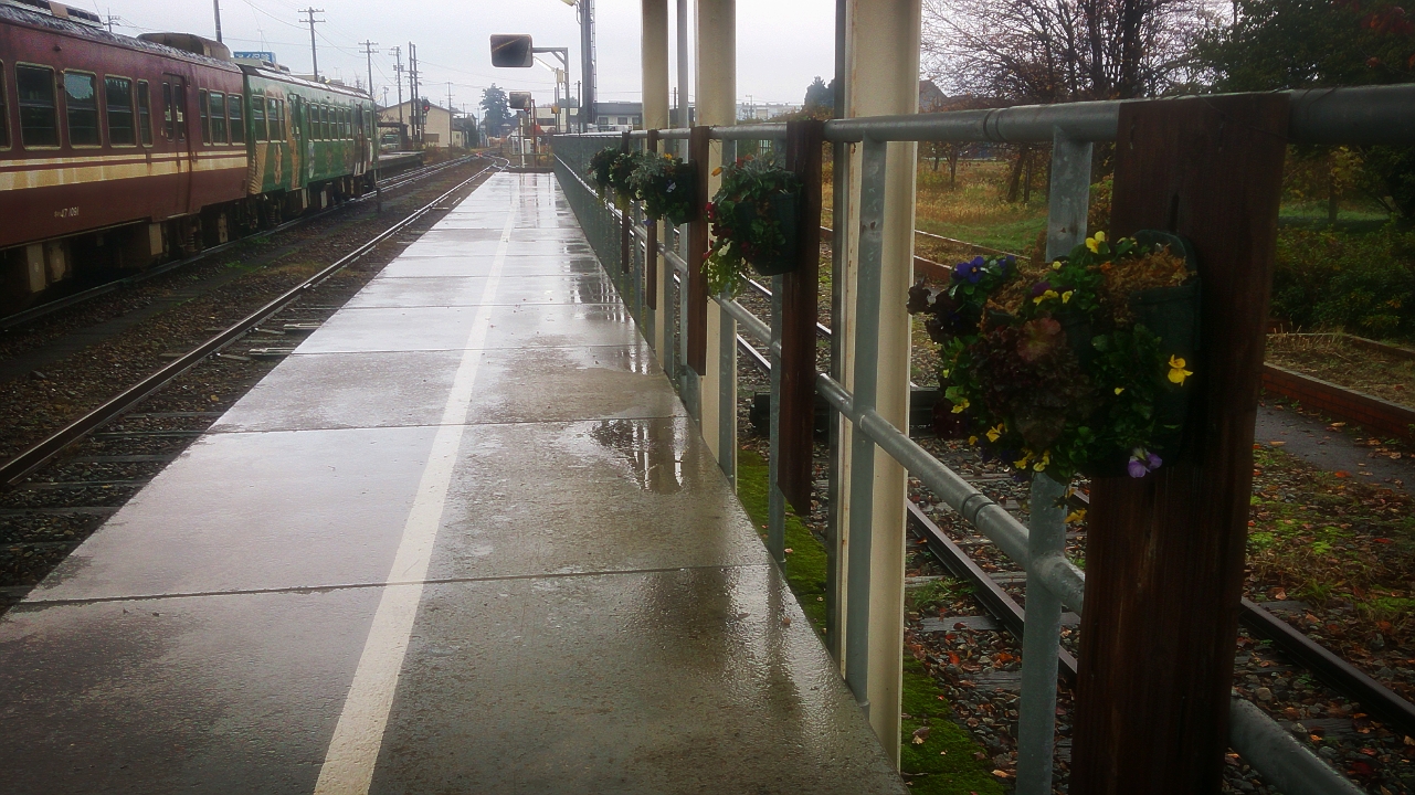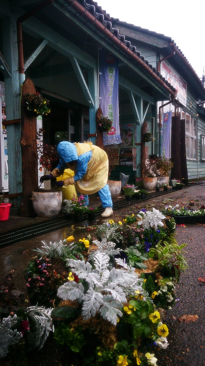 今日は、雨の中、城端駅にて、「花いっぱいのまちづくり事業」の一環で、花苗の植え替えを、