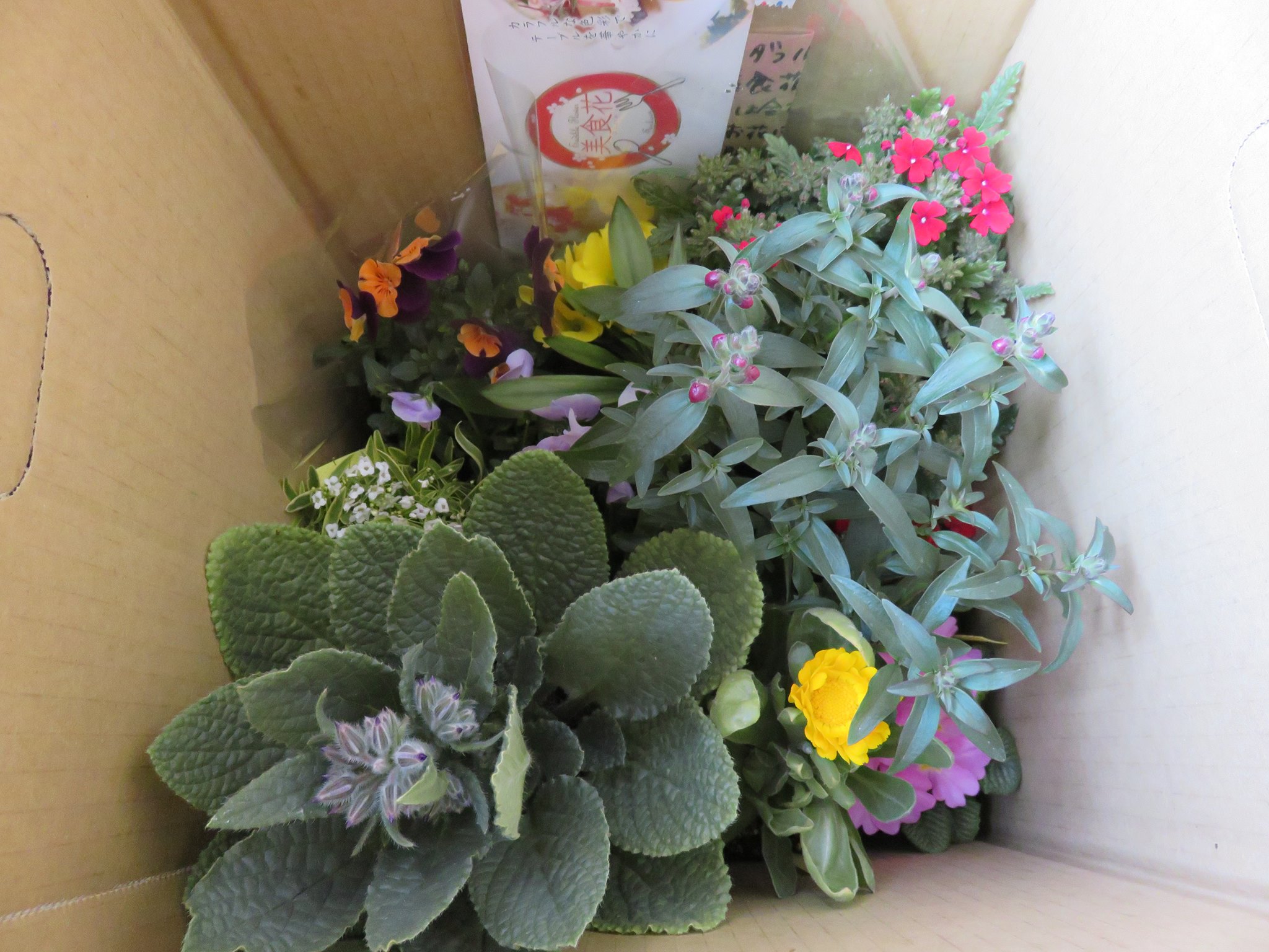 エディブルフラワー「美食花」の発送続々♪ 2017年2月28日エディブルフラワー「美食花」 フラワーンダフル日記 Tweet 美食花のご依頼が続々です♪ < 美食花5種の寄せ植え > < 美食花苗10種類 > 今の時期は、 ・ジュリアン ・ビオラ ・アリッサム ・金魚草(スナップドラゴン) ・バーベナ ・ボリジ ・キンセンカ(カレンジュラ) ・ナデシコ ・マリーゴールド ・ペンタス などのお花が随時スタンばってます☆