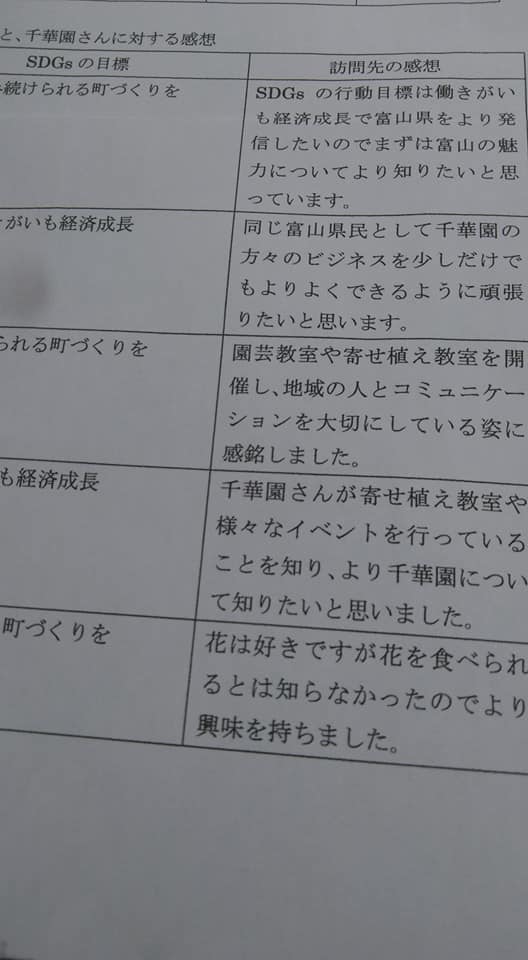 学生グループご来園🌸 2020年9月15日なんでも フラワーンダフル日記 Tweet 事前調査で千華園に興味を持ってくれた富山国際大学の学生グループがご来園🌸 SDGsという課題に熱心に取り組む姿を頼もしく思いました✨ 実りある提案を楽しみにしていまーす(笑)