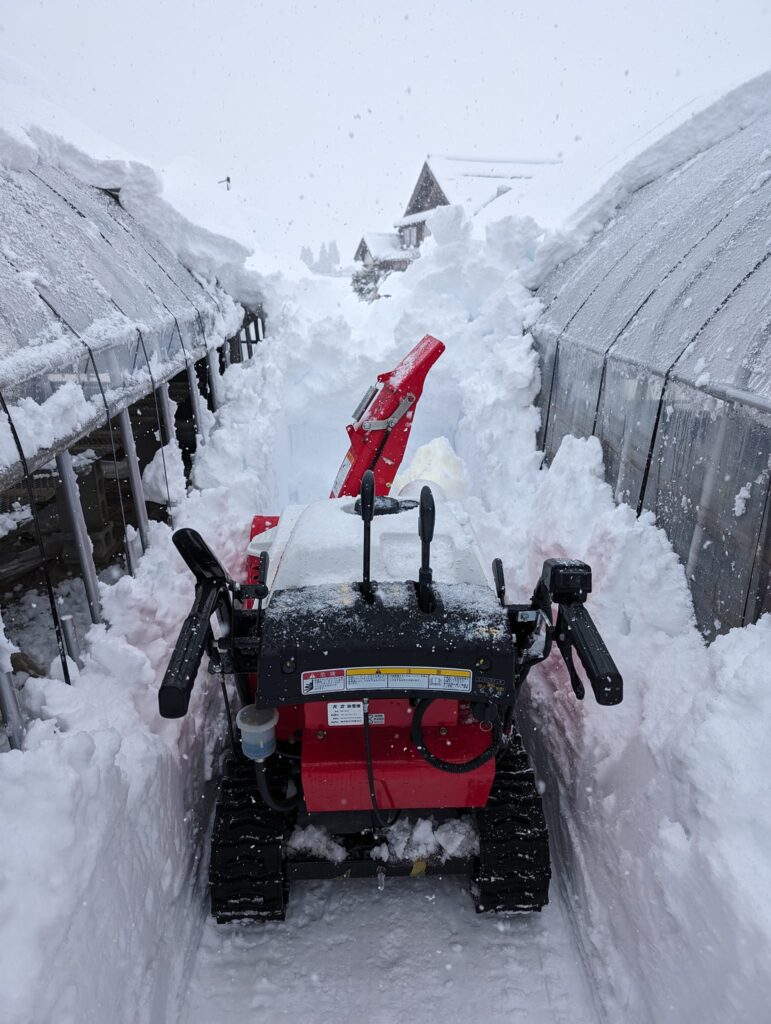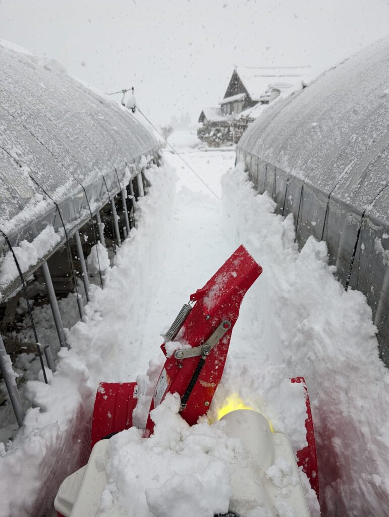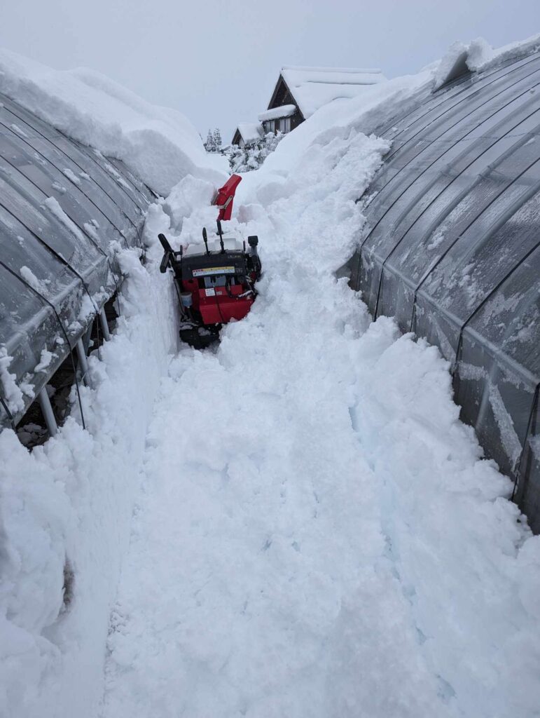 ハウスの上からなだれてきた雪に、