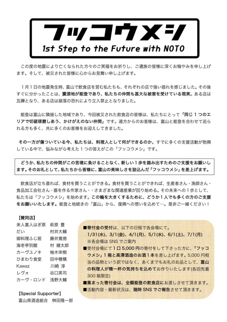 能登は富山に隣接した地域であり、今回被災された飲食店の皆様は、私たちにとって「同じ1つのエリアで切磋琢磨しあう、かけがえのない仲間」です。遠方からのお客様は、富山と能登を合わせて巡られる方も多く、共に多くのお客様をお迎えしてきました。