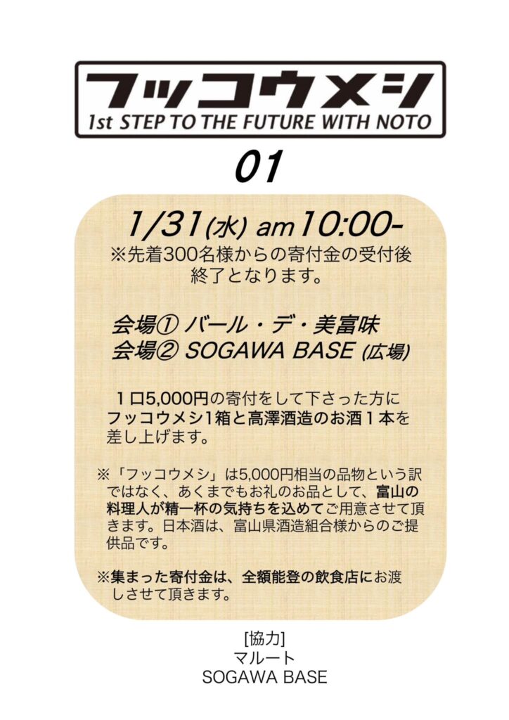 どうか、私たちの仲間がこの苦境に負けることなく、新しい1歩を踏み出すためのご支援をお願いします。そのお礼として、私たちから皆様に、富山の美味しさを詰込んだ「フッコウメシ」を差上げます。
