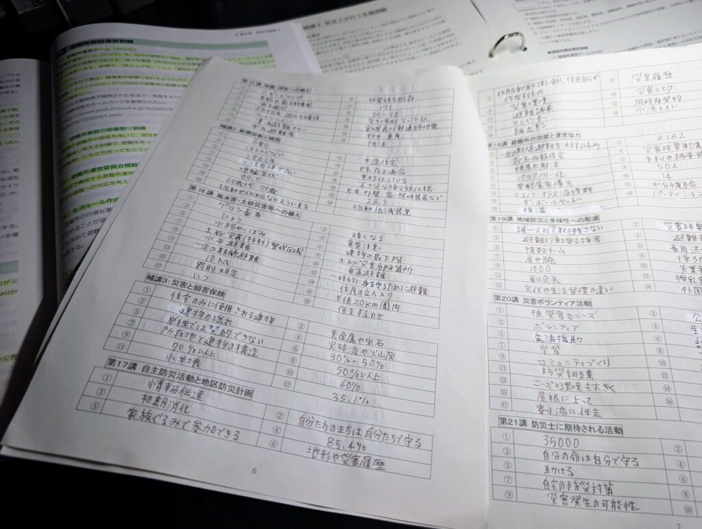 【防災士試験に向けて】 2025年10月14日イベント フラワーンダフル日記 Tweet 提出課題もなんとか完了!あとはこの膨大なテキストを頭に叩き込むのみ!! よって、今週はひっそりと“鎖国”します(笑)防災士試験に向けて、なるべくならテキストとだけ仲良く過ごしたい1週間。来週末の試験では、笑顔で“開国”できるよう頑張ります☆ 防災を学ぶことで、地域の力をもっと強くしていきたいです(*^^*)#防災士試験#防災士への道#防災リーダー#地域の力#南砺市#なんと時間#今年も挑戦中#鎖国週間#筆圧強い